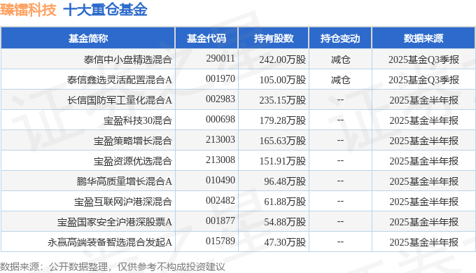 持有臻镭科技最多的基金为泰信中小盘精选混合,目前规模为17.22亿元,最新净值4.438(10月24日),较上一交易日上涨2.99%,近一年上涨53.18%。该基金现任基金经理为董季周。