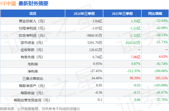 据证券之星公开数据整理,近期ST中迪(000609)发布2025年三季报。截至本报告期末,公司营业总收入1.35亿元,同比下降52.64%,归母净利润-1.51亿元,同比下降42.08%。按单季度数据看,第三季度营业总收入80.84万元,同比下降74.3%,第三季度归母净利润-6649.84万元,同比下降109.24%。本报告期ST中迪三费占比上升明显,财务费用、销售费用和管理费用总和占总营收同比增幅达185.51%。