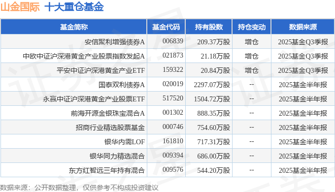 持有山金国际最多的基金为安信聚利增强债券A,目前规模为10.76亿元,最新净值1.2773(10月23日),较上一交易日上涨0.15%,近一年上涨11.96%。该基金现任基金经理为梁冰哲 柴迪伊。