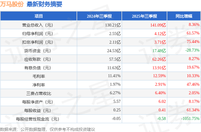 据证券之星公开数据整理,近期万马股份(002276)发布2025年三季报。截至本报告期末,公司营业总收入141.09亿元,同比上升8.36%,归母净利润4.12亿元,同比上升61.57%。按单季度数据看,第三季度营业总收入48.37亿元,同比上升7.93%,第三季度归母净利润1.61亿元,同比上升227.7%。本报告期万马股份盈利能力上升,毛利率同比增幅10.33%,净利率同比增幅47.46%。