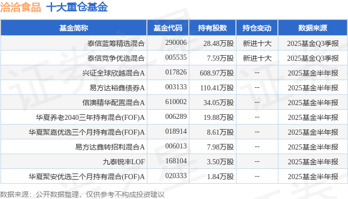 持有洽洽食品最多的基金为泰信蓝筹精选混合,目前规模为2.18亿元,最新净值1.5374(10月24日),较上一交易日下跌0.37%,近一年上涨13.21%。该基金现任基金经理为徐慕浩。