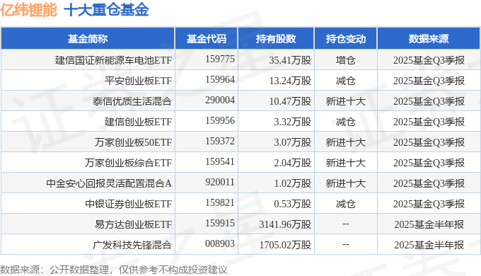 持有亿纬锂能最多的基金为建信国证新能源车电池ETF,目前规模为3.73亿元,最新净值0.8725(10月24日),较上一交易日上涨1.65%,近一年上涨53.46%。该基金现任基金经理为龚佳佳。