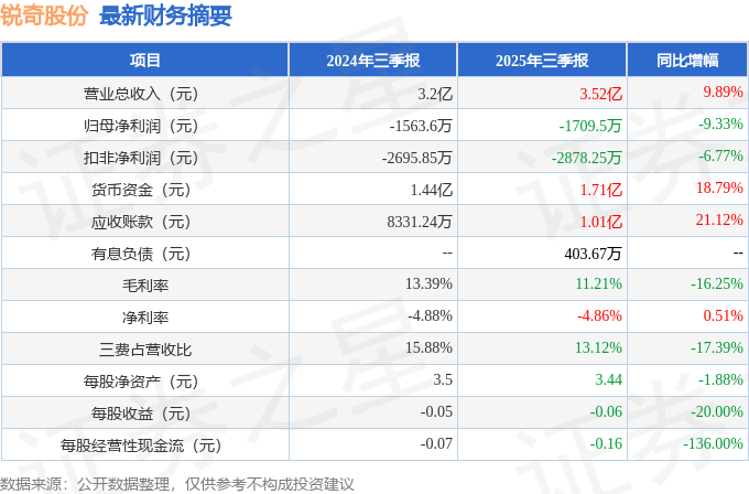 据证券之星公开数据整理,近期锐奇股份(300126)发布2025年三季报。根据财报显示,锐奇股份增收不增利。截至本报告期末,公司营业总收入3.52亿元,同比上升9.89%,归母净利润-1709.5万元,同比下降9.33%。按单季度数据看,第三季度营业总收入1.13亿元,同比上升14.74%,第三季度归母净利润-269.58万元,同比上升74.57%。