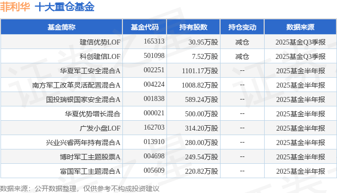 持有菲利华最多的基金为建信优势LOF,目前规模为4.74亿元,最新净值3.314(10月24日),较上一交易日上涨4.87%,近一年上涨31.12%。该基金现任基金经理为江映德。