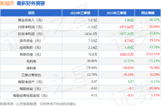 据证券之星公开数据整理,近期新城市(300778)发布2025年三季报。截至本报告期末,公司营业总收入1.06亿元,同比下降36.52%,归母净利润-1971.84万元,同比上升85.06%。按单季度数据看,第三季度营业总收入3529.61万元,同比下降28.93%,第三季度归母净利润-746.27万元,同比上升60.85%。本报告期新城市三费占比上升明显,财务费用、销售费用和管理费用总和占总营收同比增幅达32.29%。