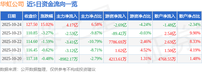 证券之星消息,截至2025年10月24日收盘,华虹公司(688347)报收于127.5元,上涨15.02%,换手率12.7%,成交量51.78万手,成交额63.29亿元。
