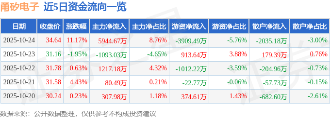 证券之星消息,截至2025年10月24日收盘,甬矽电子(688362)报收于34.64元,上涨11.17%,换手率7.28%,成交量20.42万手,成交额6.79亿元。