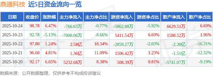 证券之星消息,截至2025年10月24日收盘,鼎通科技(688668)报收于98.78元,上涨6.47%,换手率7.35%,成交量10.24万手,成交额9.9亿元。