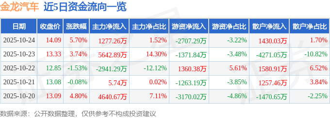 证券之星消息,截至2025年10月24日收盘,金龙汽车(600686)报收于14.09元,上涨5.7%,换手率8.31%,成交量59.58万手,成交额8.41亿元。