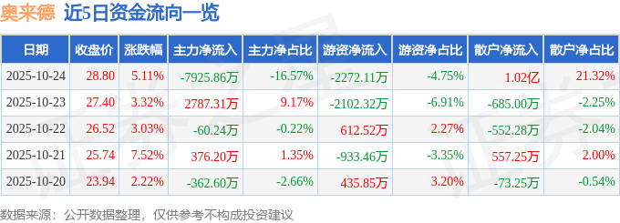 证券之星消息,截至2025年10月24日收盘,奥来德(688378)报收于28.8元,上涨5.11%,换手率6.87%,成交量16.55万手,成交额4.78亿元。