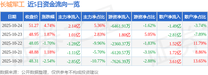 证券之星消息,截至2025年10月24日收盘,长城军工(601606)报收于51.27元,上涨4.74%,换手率10.78%,成交量78.11万手,成交额39.95亿元。