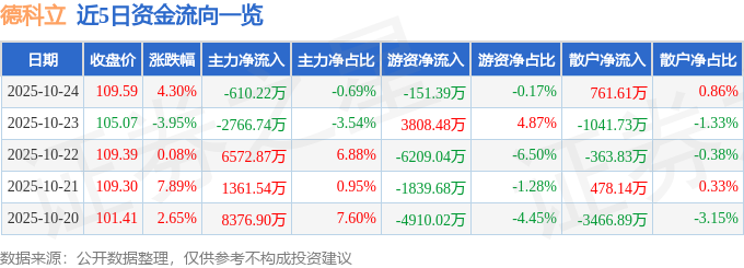 证券之星消息,截至2025年10月24日收盘,德科立(688205)报收于109.59元,上涨4.3%,换手率5.21%,成交量8.25万手,成交额8.82亿元。