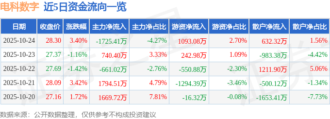 证券之星消息,截至2025年10月24日收盘,电科数字(600850)报收于28.3元,上涨3.4%,换手率2.1%,成交量14.28万手,成交额4.04亿元。