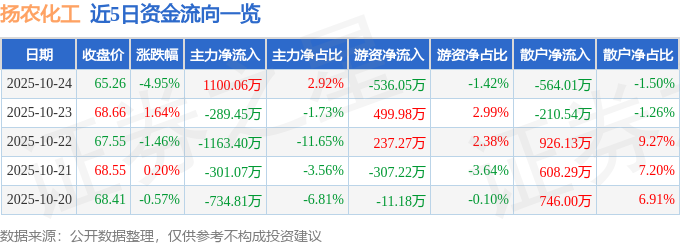 证券之星消息,截至2025年10月24日收盘,扬农化工(600486)报收于65.26元,下跌4.95%,换手率1.42%,成交量5.72万手,成交额3.77亿元。