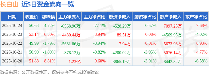 证券之星消息,截至2025年10月24日收盘,长白山(603099)报收于50.63元,下跌4.72%,换手率6.77%,成交量18.06万手,成交额9.24亿元。