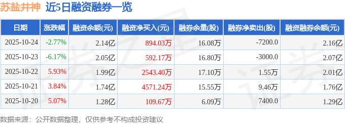 苏盐井神融资融券信息显示,融资方面,当日融资买入4474.93万元,融资偿还3580.9万元,融资净买入894.03万元,连续3日净买入累计4029.6万元。融券方面,融券卖出1500.0股,融券偿还8700.0股,融券余量16.08万股,融券余额180.74万元。融资融券余额2.16亿元。