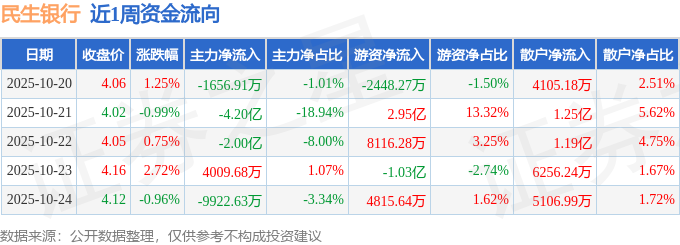 资金流向数据方面,本周民生银行主力资金合计净流出6.95亿元,游资资金合计净流入2.97亿元,散户资金合计净流入3.98亿元。本周资金流向一览见下表: