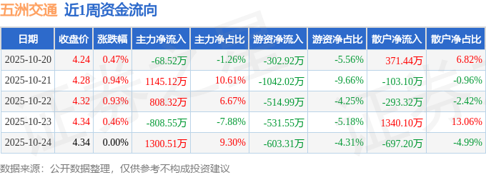 资金流向数据方面,本周五洲交通主力资金合计净流入2376.88万元,游资资金合计净流出2994.79万元,散户资金合计净流入617.91万元。本周资金流向一览见下表: