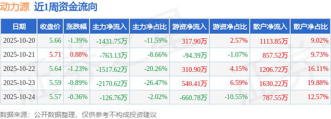 资金流向数据方面,本周动力源主力资金合计净流出6009.88万元,游资资金合计净流入414.03万元,散户资金合计净流入5595.86万元。本周资金流向一览见下表: