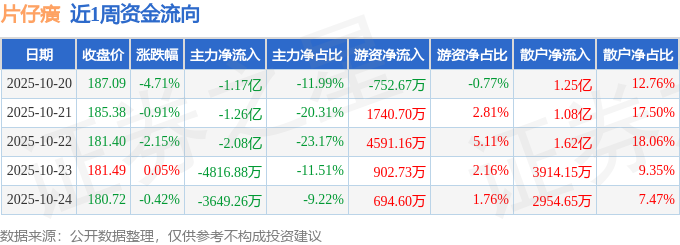 资金流向数据方面,本周片仔癀主力资金合计净流出5.35亿元,游资资金合计净流入7176.52万元,散户资金合计净流入4.64亿元。本周资金流向一览见下表: