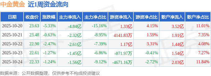 资金流向数据方面,本周中金黄金主力资金合计净流出12.79亿元,游资资金合计净流入2.35亿元,散户资金合计净流入10.43亿元。本周资金流向一览见下表:
