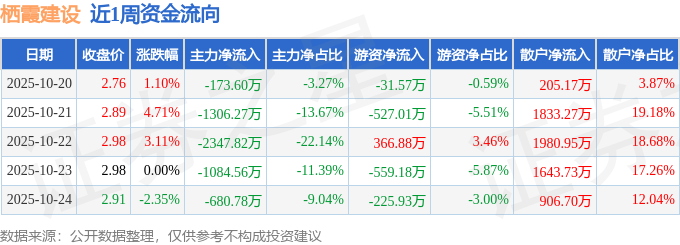 资金流向数据方面,本周栖霞建设主力资金合计净流出5593.02万元,游资资金合计净流出976.8万元,散户资金合计净流入6569.82万元。本周资金流向一览见下表: