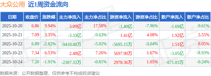 资金流向数据方面,本周大众公用主力资金合计净流入1.06亿元,游资资金合计净流入3128.13万元,散户资金合计净流出1.37亿元。本周资金流向一览见下表: