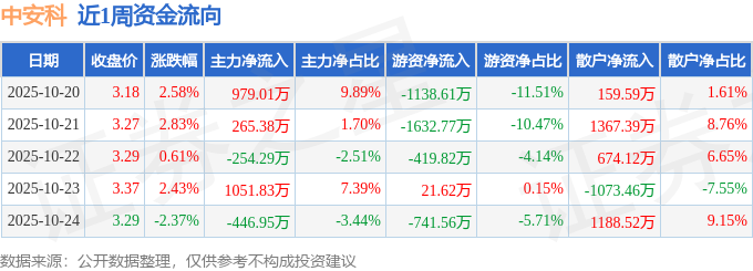 资金流向数据方面,本周中安科主力资金合计净流入1594.99万元,游资资金合计净流出3911.14万元,散户资金合计净流入2316.16万元。本周资金流向一览见下表: