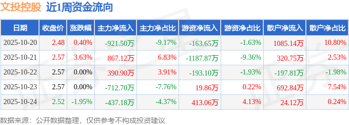 资金流向数据方面,本周文投控股主力资金合计净流出813.35万元,游资资金合计净流出1111.69万元,散户资金合计净流入1925.05万元。本周资金流向一览见下表:
