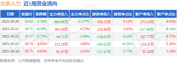 资金流向数据方面,本周北京人力主力资金合计净流出284.29万元,游资资金合计净流入161.23万元,散户资金合计净流入123.06万元。本周资金流向一览见下表: