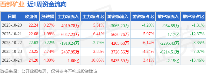 资金流向数据方面,本周西部矿业主力资金合计净流入2.67亿元,游资资金合计净流入1.59亿元,散户资金合计净流出4.26亿元。本周资金流向一览见下表:
