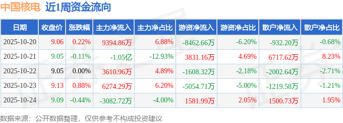 资金流向数据方面,本周中国核电主力资金合计净流入5648.62万元,游资资金合计净流出9712.54万元,散户资金合计净流入4063.93万元。本周资金流向一览见下表: