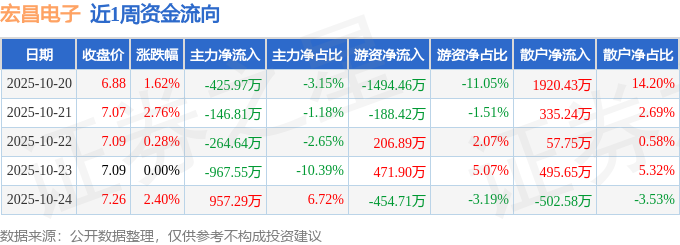 资金流向数据方面,本周宏昌电子主力资金合计净流出847.68万元,游资资金合计净流出1458.8万元,散户资金合计净流入2306.48万元。本周资金流向一览见下表: