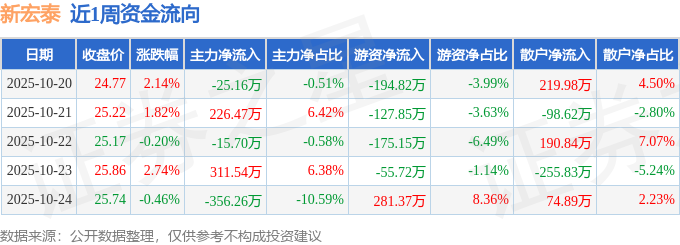 资金流向数据方面,本周新宏泰主力资金合计净流入140.9万元,游资资金合计净流出272.16万元,散户资金合计净流入131.27万元。本周资金流向一览见下表: