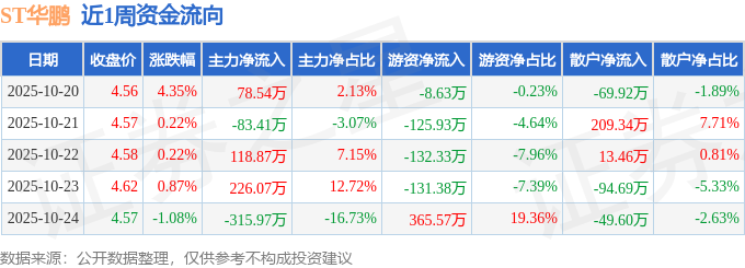 证券之星消息,截至2025年10月24日收盘,ST华鹏(603021)报收于4.57元,较上周的4.37元上涨4.58%。本周,ST华鹏10月22日盘中最高价报4.69元。10月20日盘中最低价报4.39元。ST华鹏当前最新总市值14.62亿元,在家居用品板块市值排名73/73,在两市A股市值排名5145/5160。
