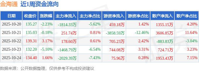 资金流向数据方面,本周金海通主力资金合计净流出4882.16万元,游资资金合计净流出1874.13万元,散户资金合计净流入6756.29万元。本周资金流向一览见下表: