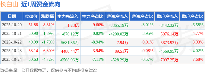 资金流向数据方面,本周长白山主力资金合计净流入3661.0万元,游资资金合计净流出8496.05万元,散户资金合计净流入4835.05万元。本周资金流向一览见下表: