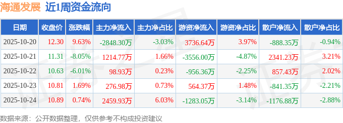 资金流向数据方面,本周海通发展主力资金合计净流入1202.31万元,游资资金合计净流出1494.39万元,散户资金合计净流入292.08万元。本周资金流向一览见下表: