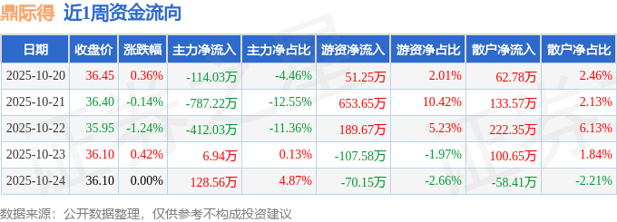 资金流向数据方面,本周鼎际得主力资金合计净流出1177.78万元,游资资金合计净流入716.84万元,散户资金合计净流入460.94万元。本周资金流向一览见下表: