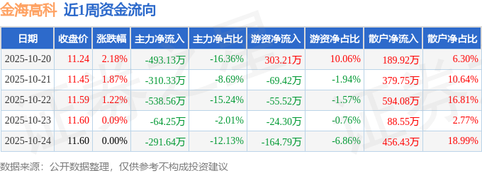 资金流向数据方面,本周金海高科主力资金合计净流出1697.9万元,游资资金合计净流出10.82万元,散户资金合计净流入1708.72万元。本周资金流向一览见下表: