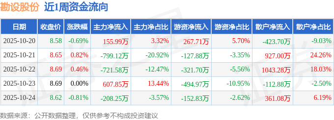 资金流向数据方面,本周勘设股份主力资金合计净流出965.11万元,游资资金合计净流出829.66万元,散户资金合计净流入1794.78万元。本周资金流向一览见下表: