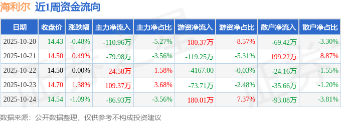 资金流向数据方面,本周海利尔主力资金合计净流出143.91万元,游资资金合计净流入167.01万元,散户资金合计净流出23.09万元。本周资金流向一览见下表: