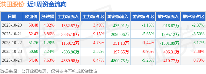 沪深股通持股方面,截止2025年10月24日收盘,洪田股份沪股通持股数为109.07万股,占流通股比为52.0%。