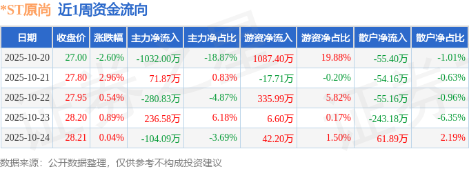 资金流向数据方面,本周*ST原尚主力资金合计净流出1108.47万元,游资资金合计净流入1454.49万元,散户资金合计净流出346.02万元。本周资金流向一览见下表:
