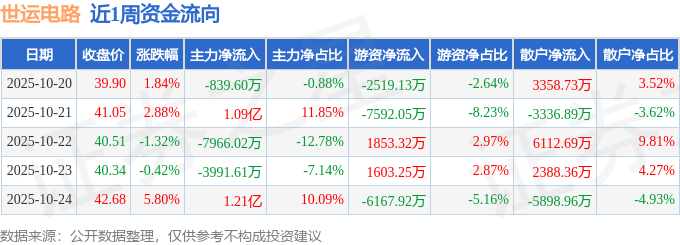 资金流向数据方面,本周世运电路主力资金合计净流入1.02亿元,游资资金合计净流出1.28亿元,散户资金合计净流入2623.94万元。本周资金流向一览见下表: