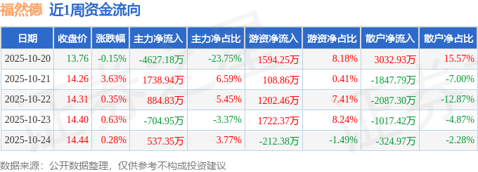 资金流向数据方面,本周福然德主力资金合计净流出2171.01万元,游资资金合计净流入4415.55万元,散户资金合计净流出2244.54万元。本周资金流向一览见下表: