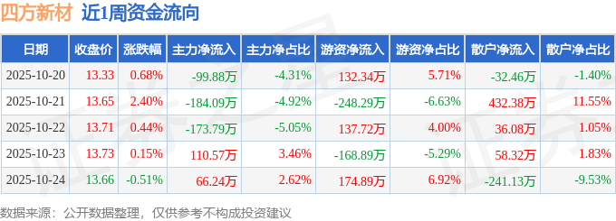 资金流向数据方面,本周四方新材主力资金合计净流出280.96万元,游资资金合计净流入27.77万元,散户资金合计净流入253.19万元。本周资金流向一览见下表: