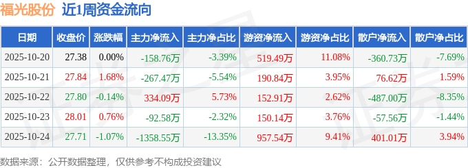 资金流向数据方面,本周福光股份主力资金合计净流出1543.27万元,游资资金合计净流入1970.93万元,散户资金合计净流出427.65万元。本周资金流向一览见下表: