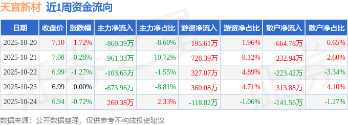 资金流向数据方面,本周天宜新材主力资金合计净流出2338.95万元,游资资金合计净流入1492.32万元,散户资金合计净流入846.63万元。本周资金流向一览见下表:
