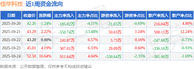 资金流向数据方面,本周佳华科技主力资金合计净流入724.76万元,游资资金合计净流出476.21万元,散户资金合计净流出248.55万元。本周资金流向一览见下表: